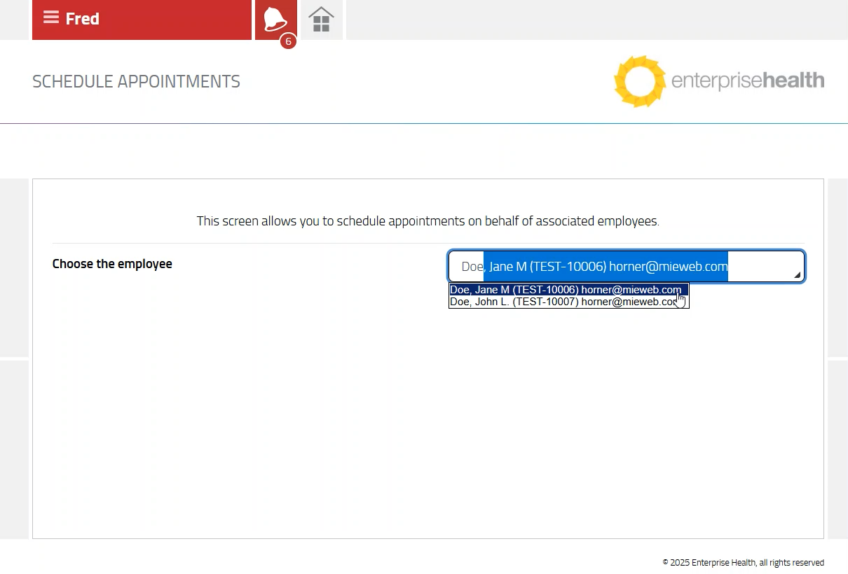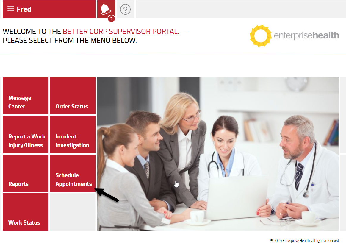The Supervisor Portal allows supervisors to schedule appointments on behalf of their direct subordinates. The Schedule Appointments module is available in databases on the 202503 release of Enterprise Health .