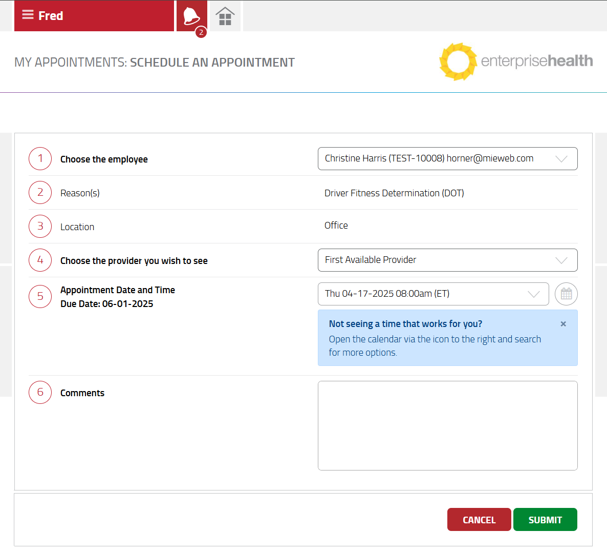 - Select the Reason(s), locations, provider, appointment date/time and add optional Provider comments, then select the green Submit button to schedule the appointment. If scheduling an appointment on demand, the supervisor will be required to enter all fields, except the comment, before submitting the page. If scheduling an appointment from the Appointments To Be Scheduled section, the Reason(s)/(appointment type) will default for the supervisor and can not be changed. Additionally, if only one location and/or provider offers this appointment type, the location and/or provider may be automatically selected and default for the supervisor when scheduling the appointment. The date/time format, calendar options and comments are also configurable items and may differ slightly from what is pictured below.