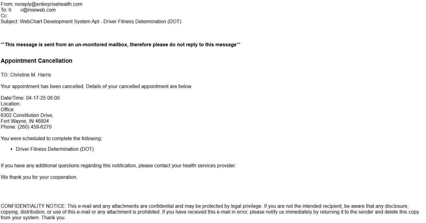 Additionally, the employee will receive the standard out of the box appointment cancellation email.
