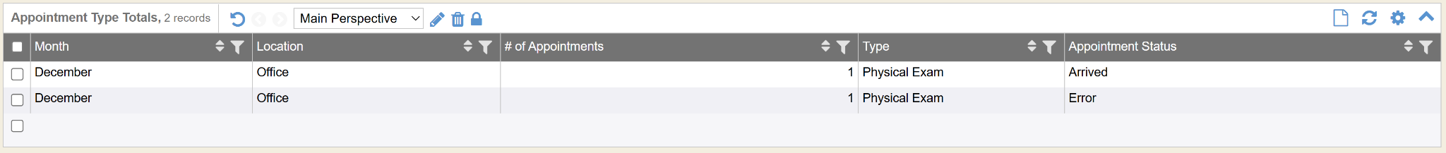 The Appointments Types Total report displays a list of scheduled appointments by type and grouped by month found within the system in a DataVis output.