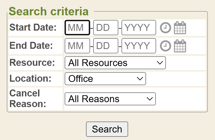 The Appointment Cancel Reason Report displays a report of cancelled appointments according to the cancellation reason code you select, location and date range.
