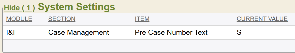 Enterprise Health automatically assigns an incremental case number to every created case/incident. Enterprise Health uses prefixes the case number with whatever is the ‘value’ in this system setting. By default, the value in the system setting is S which means every case number assigned using Enterprise Health will start with the letter S. Enterprise Health then follows that pre-text by assigning the case number as the current year (ex: 2025) and then follows that prefix with a dash – then the auto-incremental case id#. Final result of an assigned case number to a case/incident (for example) would show as: