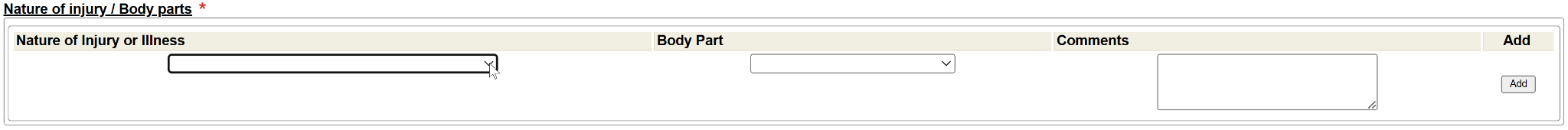 - Nature of Injury or Illness: This is an auto-complete search filter field and is buildable, meaning you can run the report to give you results filtered by one or more specific natures of the injury or illness.