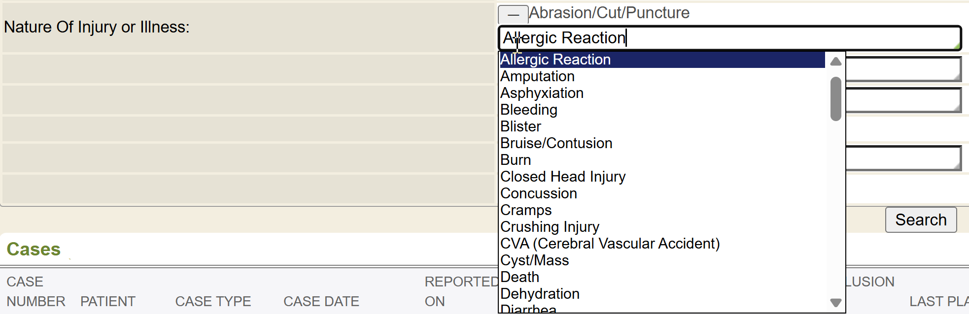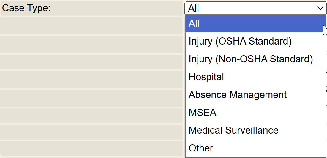 - Case Type: This is a drop-down search filter field. Our different case types available are listed here to run a report to filter by case type if needed. If a patient/employee has a case (incident), then it is stored as a specific type.