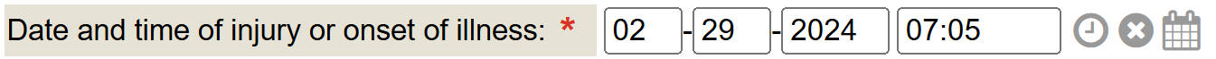 - Incident Datetime: These start/end date range search filter fields will result only cases/incidents that fall in that date range for injury or onset of illness. The incident date/time is captured in the case/incident section of an encounter in the field named Date and time of injury or onset of illness from an injury type case.