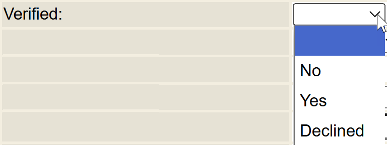 - Verified: This is a drop-down search filter field. Our different verified determination choices available are listed here to run a report to filter by verification if needed.