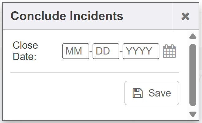 - Conclusion Date: This displays the closed/conclusion date for the case/incident. See Date Filters search filter field information in previous pages.