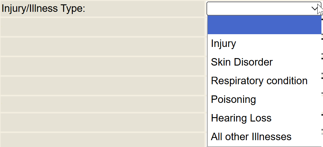 - Injury/Illness Type: This displays the Injury/Illness type of a work related case/incident. See Injury/Illness Type filter field information in previous pages.