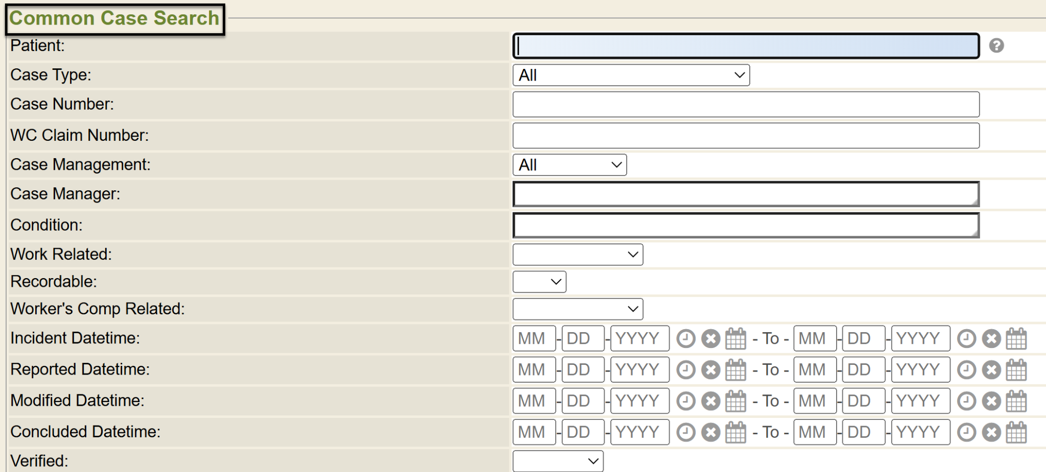 - Concluded Datetime: These start/end date range search filter fields will result only cases/incidents that fall in that date range as being closed (concluded). Cases/incidents can be closed via the patient’s/employee’s Incidents chart tab, or when the Case section in an encounter is expanded.