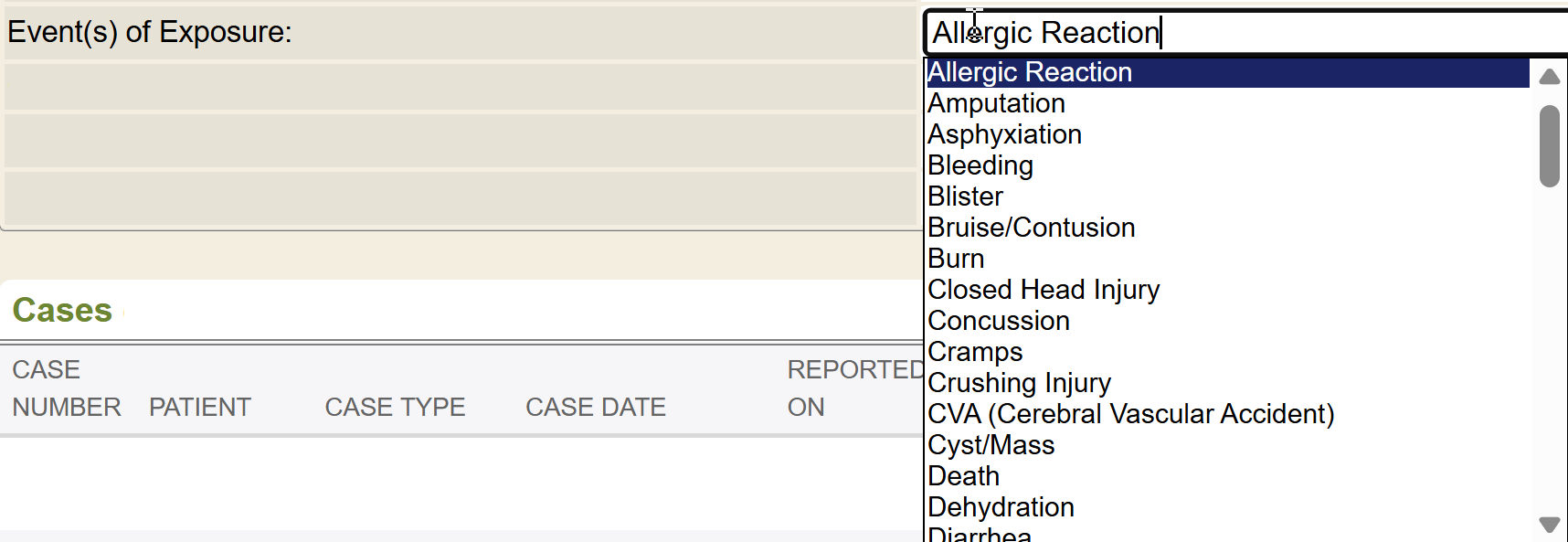 - Event of Exposure: This is an auto-complete search filter field. Our different Event choices available are listed here to run a report to filter by determination if needed.