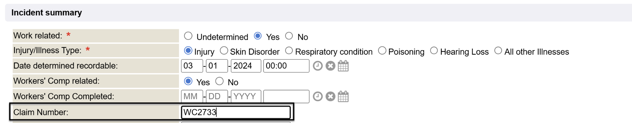 - This pulls from the field named Claim Number that was captured in the case/incident summary section of an encounter. The Incident Summary section is separate from the case section and the worker’s compensation inputs expand/open for data input if workers’ comp related is documented as ‘yes’ in the patient’s/employee’s case/incident. This is an additional section found in the dynamic encounter (sometimes it’s found in the Assessment parent jump tab section or elsewhere). If you do not have this section named Incident Summary and need to capture such workers’ compensation inputs, please contact your MIE Implementer so it can be configured.