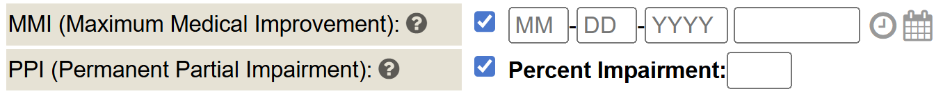 - If your system does have PPI and MMI enabled on your system, you will see those data input fields in the Case section of the encounter. Check the box for MMI and the Date field will display. Check the box for PPI and the Percent Impairment field will display. The Common Case/Incident Search report can be filtered by the MMI and/or PPI field.