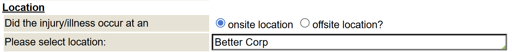 - This pulls from the auto-complete field named Please Select that was entered on the case/incident section of an encounter when the injury/illness is marked as having occurred onsite. These auto-complete onsite location choices custom and specific to your company’s onsite locations you have on premises and would have been configured by your MIE Implementer.