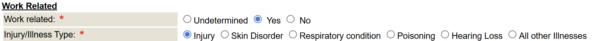 - If a case/incident has radio button “undetermined” or “yes” selected for Work Related input required field, then another required input field named Injury/Illness type will expand to select the injury/illness type. The data documented here is what is available via that drop-down filter choice in this report.