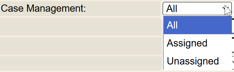 - Case Management: This is a drop-down search filter field. It looks to see if a Case Management encounter (visit type CMWR) is linked to a case/incident. If it is, it’s considered “assigned”.