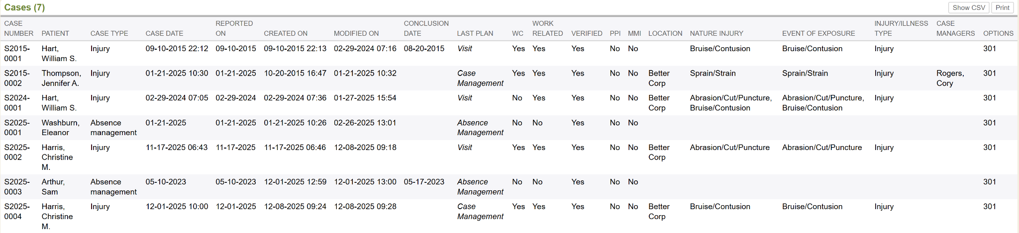 - Patient: This displays the last name,first name of the patient/employee on the case/incident. See patient search filter field information in previous pages.