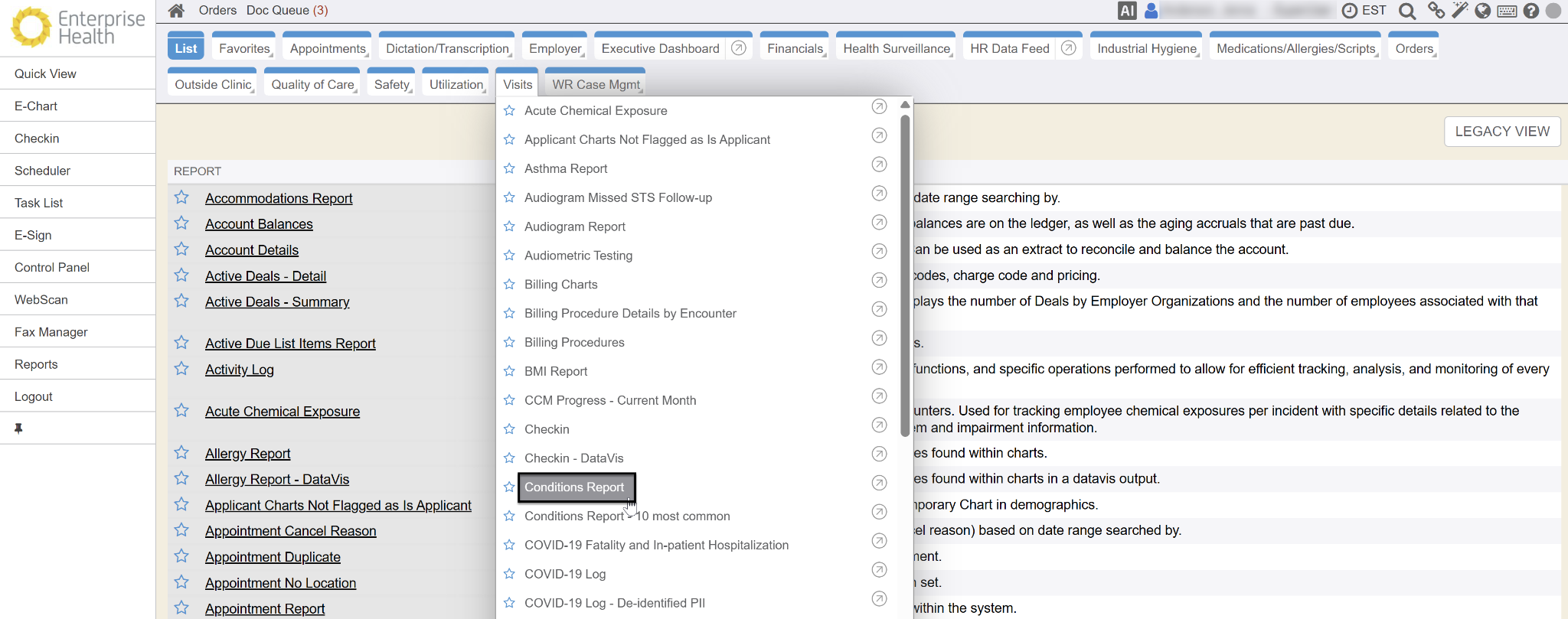 Click the Visits tab from the top tab menu and select the Conditions Report.