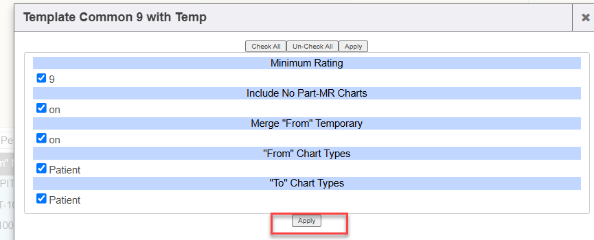 It will open a pop-up with a list of fields that are attached to this saved template (to run the report by) and all will be checkmarked by default. If you wish to run the same report that the saved template states, simply click the APPLY button. If you wish to not include a previously saved filter item, then uncheckmark it and then run the report by clicking the APPLY button and it populates the Duplicate Charts Merge Report search filter fields based on what you have checkmarked from the saved template.