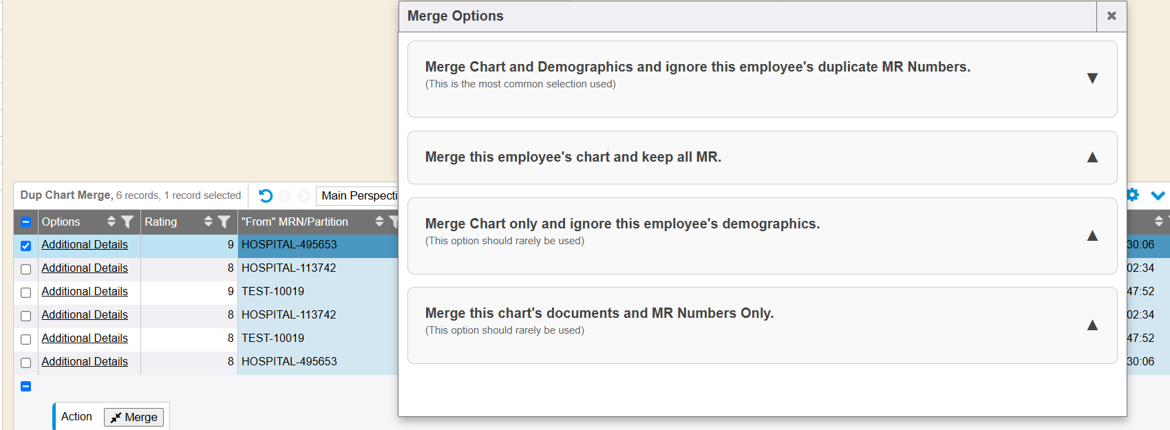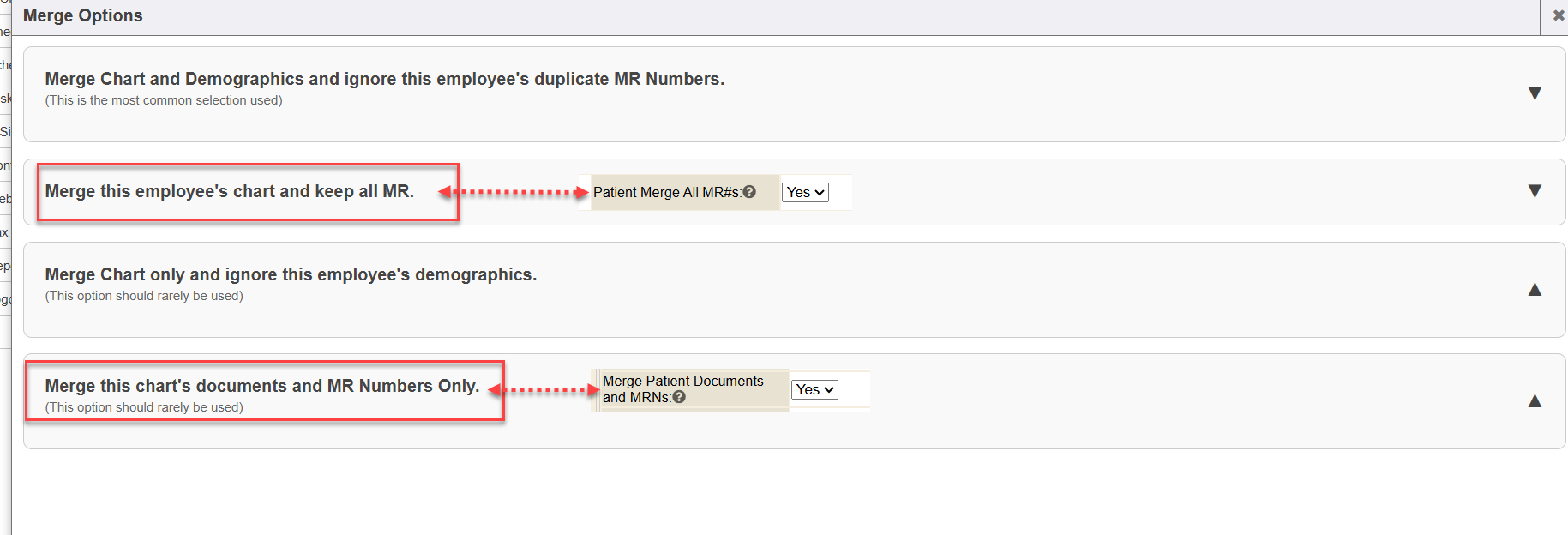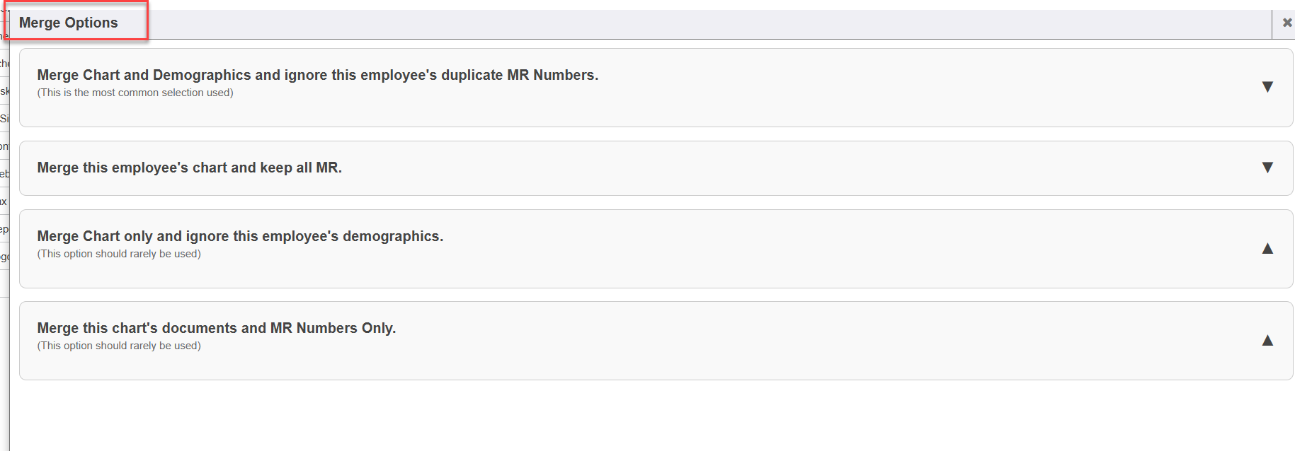 - Merge Chart only and ignore this employee’s demographics: (This option should rarely be used) This option will merge and only keep the MR number of the chart the documents & chart are being merged to (regardless of partitions being merged).