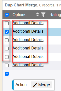 - The checkbox option means you are selecting that line item(s) of a “From” chart to merge into the “To” chart on the line item(s) you selected. When a line item is checkmarked, the Action: Merge button functionality will activate for performable use.