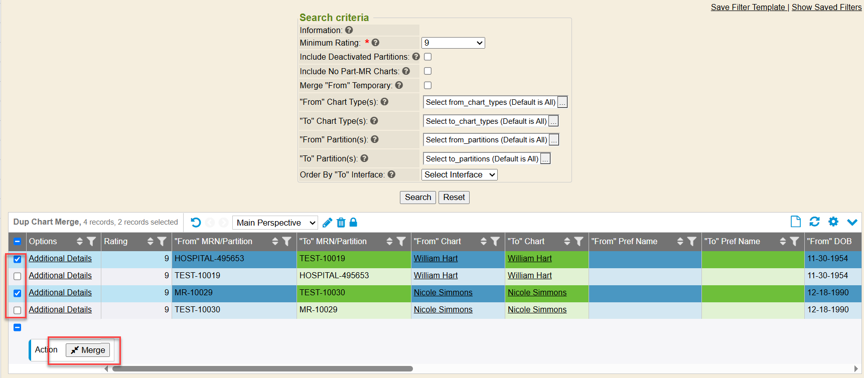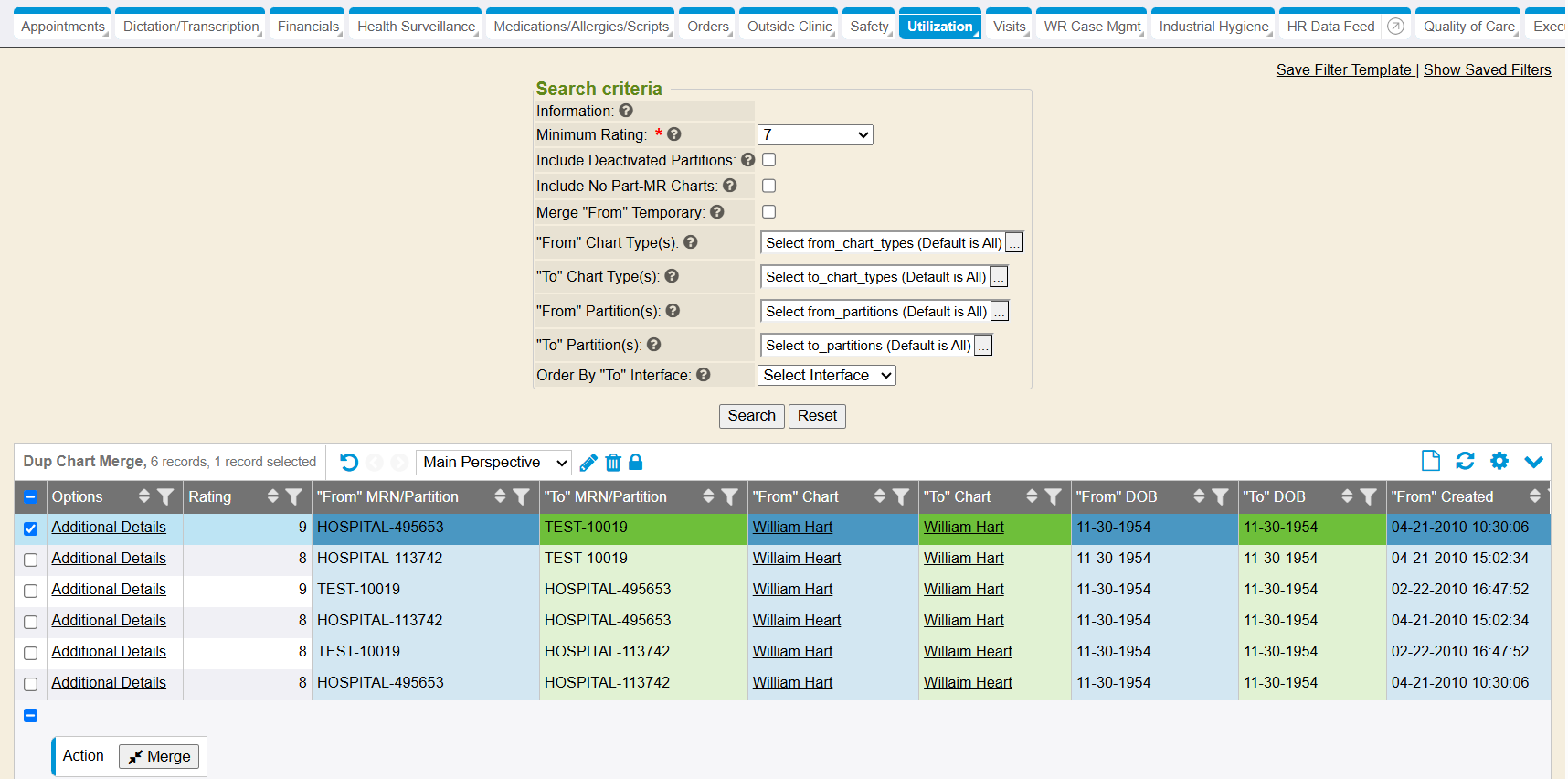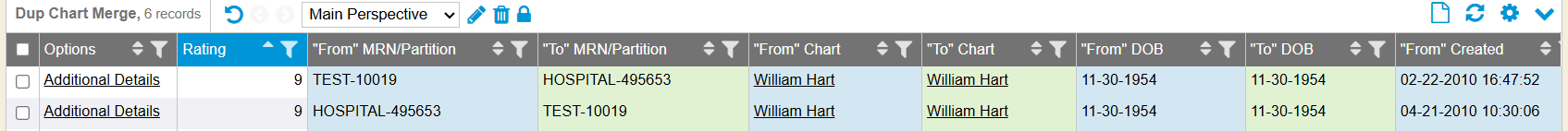- Rating: Is the rating that the system gives when analyzing the “From” chart to the “To” chart. The higher the rating, the more likely this is the same person with duplicate chart(s).