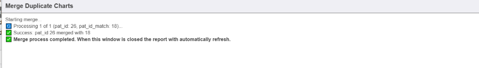 As the pop-up screen states, once the merge process is completed, the pop-up window will close and the Duplicate Chart Merge datavis report will refresh automatically and will have removed any duplicate charts that were merged according to the search criteria you are set to.