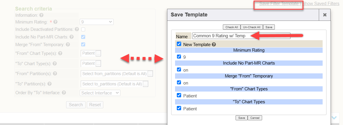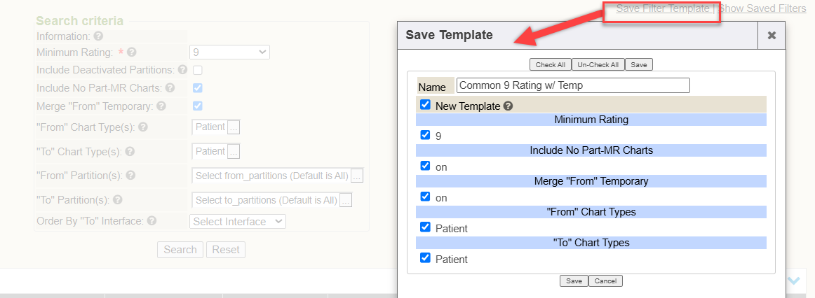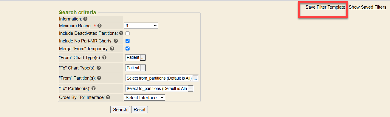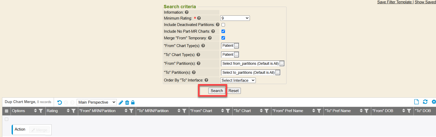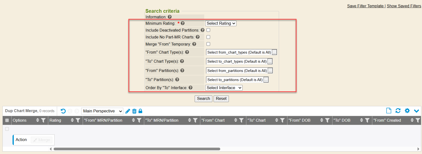 To “save” a new report filter template, you need to enter in all the search criteria fields for the report from the Duplicate Charts-Merge report. When you are done, you can click SEARCH to run the report and still access the save filter templates link even after you run a report.