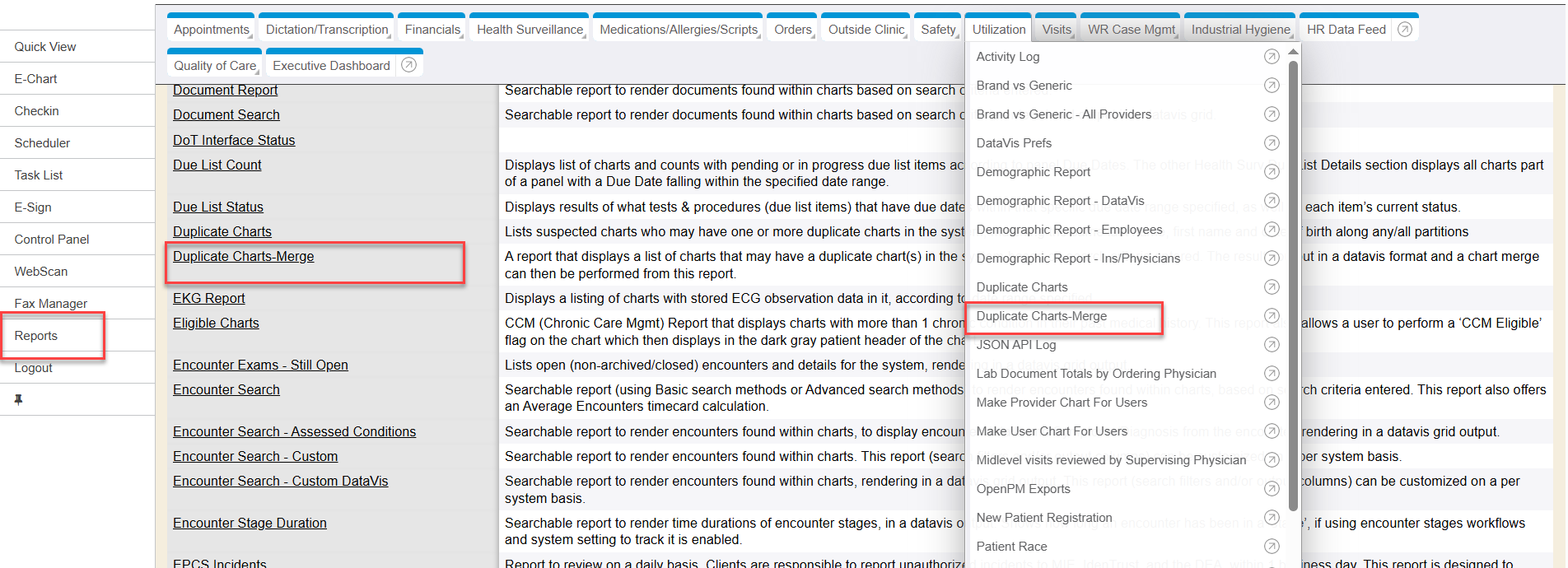 Various scenarios can lead to possible duplicate charts in the system. One example could be from where a chart was created via an interface then a duplicate chart was created manually. Another example could be where a patient had duplicate charts with a different last name or first name. In any case, the new Duplicate Chart-Merge report makes it easy to search and output possible charts that may have duplicates (based on a rating). The Duplicate Chart-Merge report also easily allows a user to validate possible duplicate charts and merge a “from” chart into a “to” chart.
