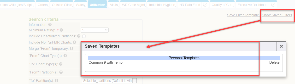 If you wish to access a previously saved template and want to run the same report again, click the Show Saved Filters link. You will see a list of the choices and what the report is named. If you have security privilege, you can delete any saved filter reports from here too so it cannot be utilized anymore.