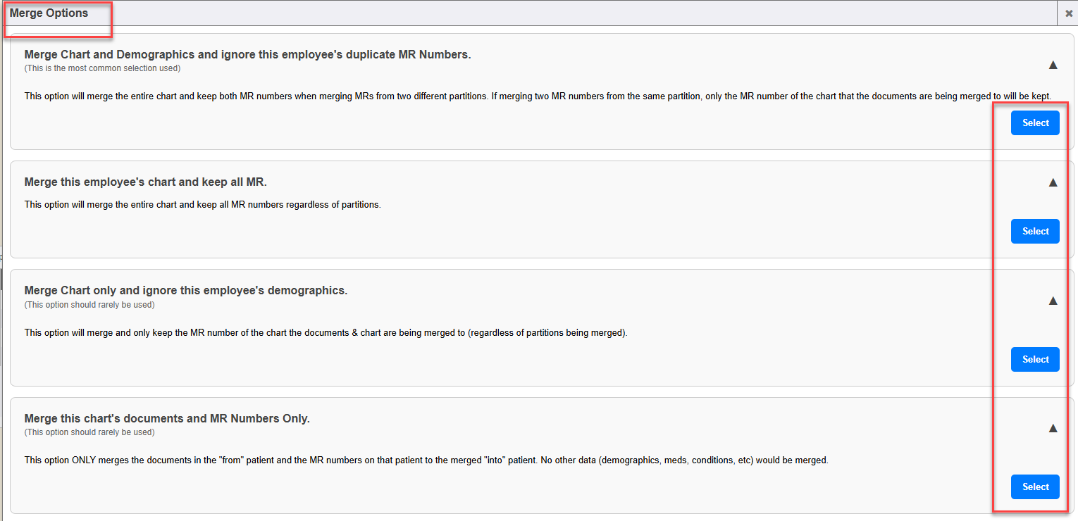 - Merge this chart’s documents and MR Numbers Only: (This option should rarely be used) This option ONLY merges the documents in the “from” patient and the MR numbers on that patient to the merged “into” patient. No other data (demographics, meds, conditions, etc) would be merged.