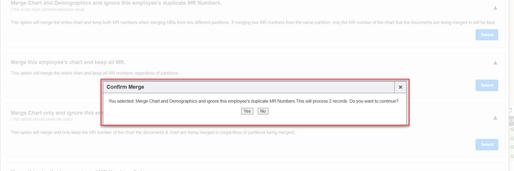 - Merge Chart and Demographics and ignore this employee’s duplicate MR Numbers: (This is the most common selection used) This option will merge the entire chart and keep both MR numbers when merging MRs from two different partitions. If merging two MR numbers from the same partition, only the MR number of the chart that the documents are being merged to will be kept.