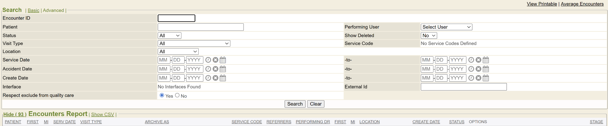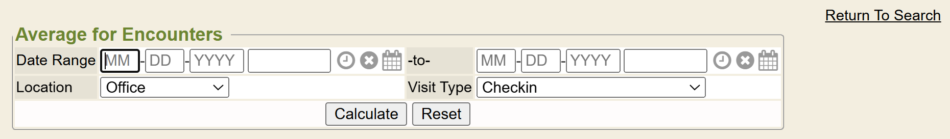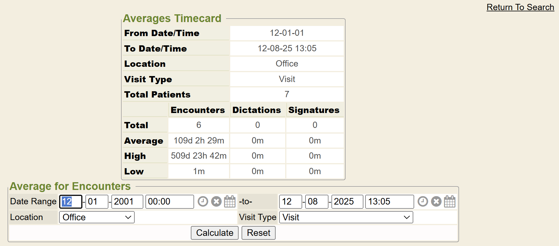 - Average Encounters: If you click this link (next to View Printable) then it will open a search screen for Average For Encounters. You can enter the specific fields and click CALCULATE button and it will calculate the average time card for a specific encounter(s). It also gives other totals/averages for dictations and signatures related to the visit type(s) you selected.