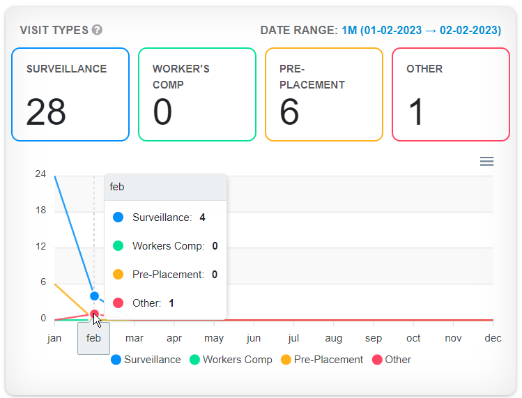 Other is count of encounter document types: Injection Only Visit (INJV), Brief Note Visit (BRIEFNOTE), Drug & Alcohol Visit (DA), Wellness Visit (WELLNESS), Travel Consult (TRAVEL), Non-Occ Health - Initial Exam (NOHI), Non-Occ Health - Follow Up Exam (NOHFU), Results (RESULTS), Return to Work Visit (RTW), Visit (VISIT)