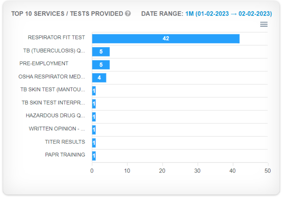Top 10 Services/Tests Provided section will display the count of encounter order items in completed status, according to volume completed. Deleted encounter order items and patient/employee charts marked as excluded from quality care (with completed encounter order items) are not included in the counts.