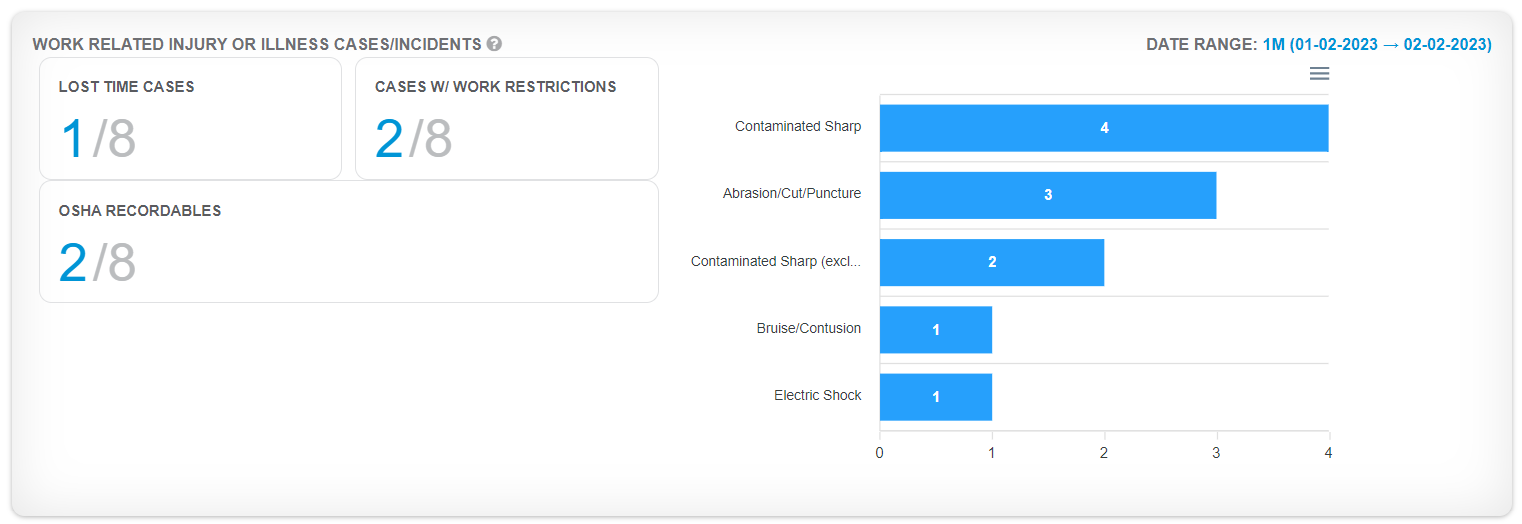 The Work Related Injury or Illness Cases/Incidents section provides analytics on work related cases/incidents. If a date range is used, it will look at the Case Date. Location search filter is not applicable to this section. If the Employer Organization search filter is used, it looks at the Employer relationship in the chart relationships. Deleted cases/incidents and charts marked as Exclude from Quality Care are ommited from the counts.