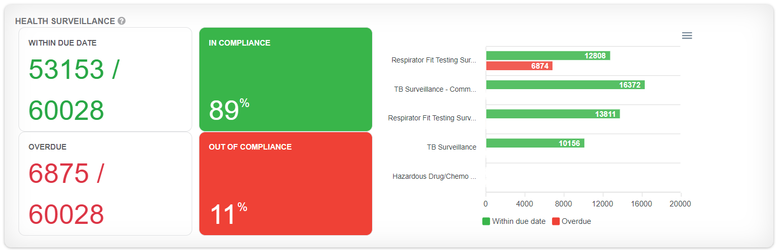 Within Due Date: looks at current members of Health Surveillance Panel Membership (record status=current) in comparison to its respective health surveillance panel due date (patient panel status). Numerator is a unique total count of current health surveillance panel memberships that are not overdue according to its respective due date (patient panel status is not overdue). Denominator is a unique grand total count of all current health surveillance panel memberships (whether overdue or not). In Compliance percentage: is the overall percentage of all current health surveillance memberships that are compliant (within its due date where patient panel status is not overdue) in comparison to the grand total count of all current health surveillance memberships (whether overdue or not).