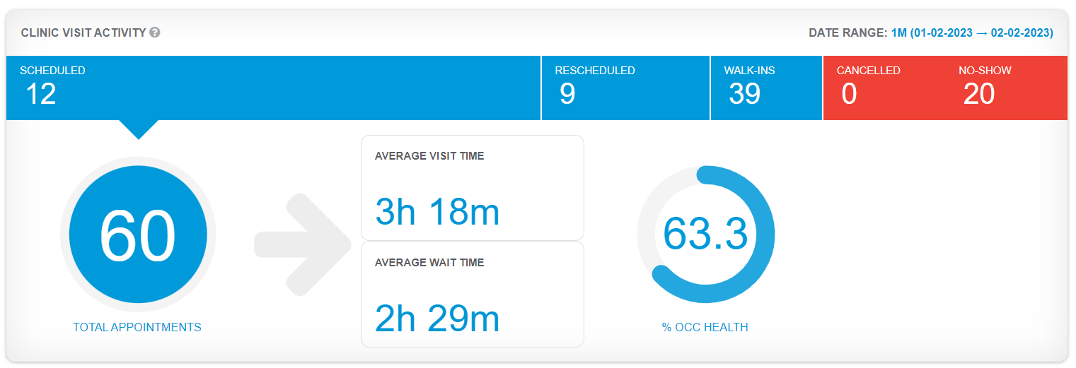 The Clinic Visit Activity section provides analytics on appointments and visits. If a date range is used, it will look at the date on the appointment and/or checkin. If a location is used in the search filter, it coincides with the appointment location, except for walk-ins which will use encounter location because there is not typically an appointment used for walk-ins. If the Employer Organization search filter is used, it looks at the Employer relationship in the chart relationships.
