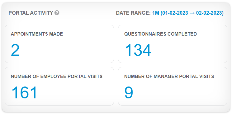 Portal Activity section will display the count of specific activity according to date of service found within the search criteria. Search filtering can be done by Location, being the selected PO location of a performing provider on a scheduled appointment. Additional search filtering can be done by Employer Organization, being the employer relationship a patient/employee chart has within its demographic relationships.