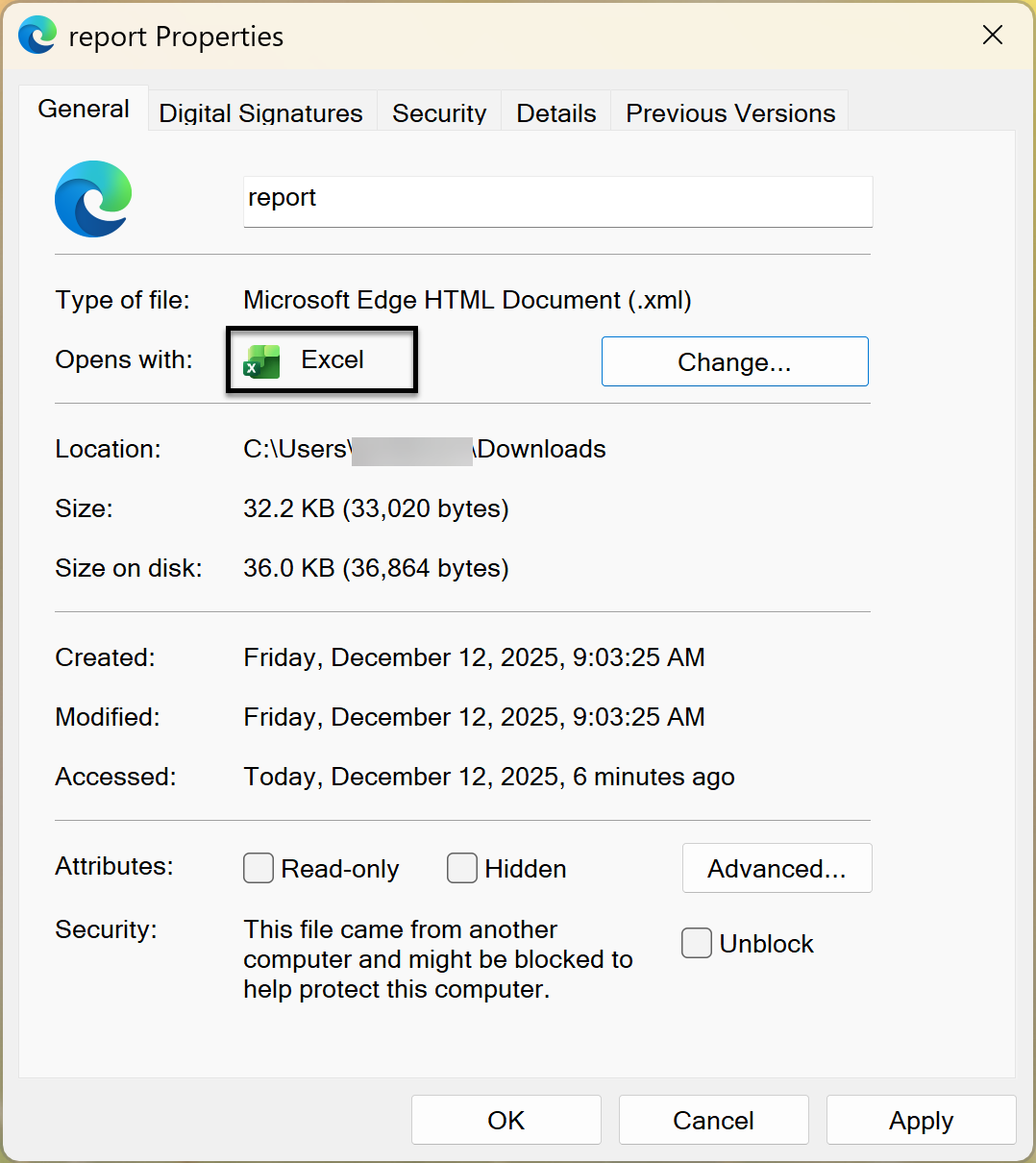 You have now completed and successfully changed the default of XML files to open with Excel. The properties screen should look like this where it states the type of file is XML and it will open with Excel.