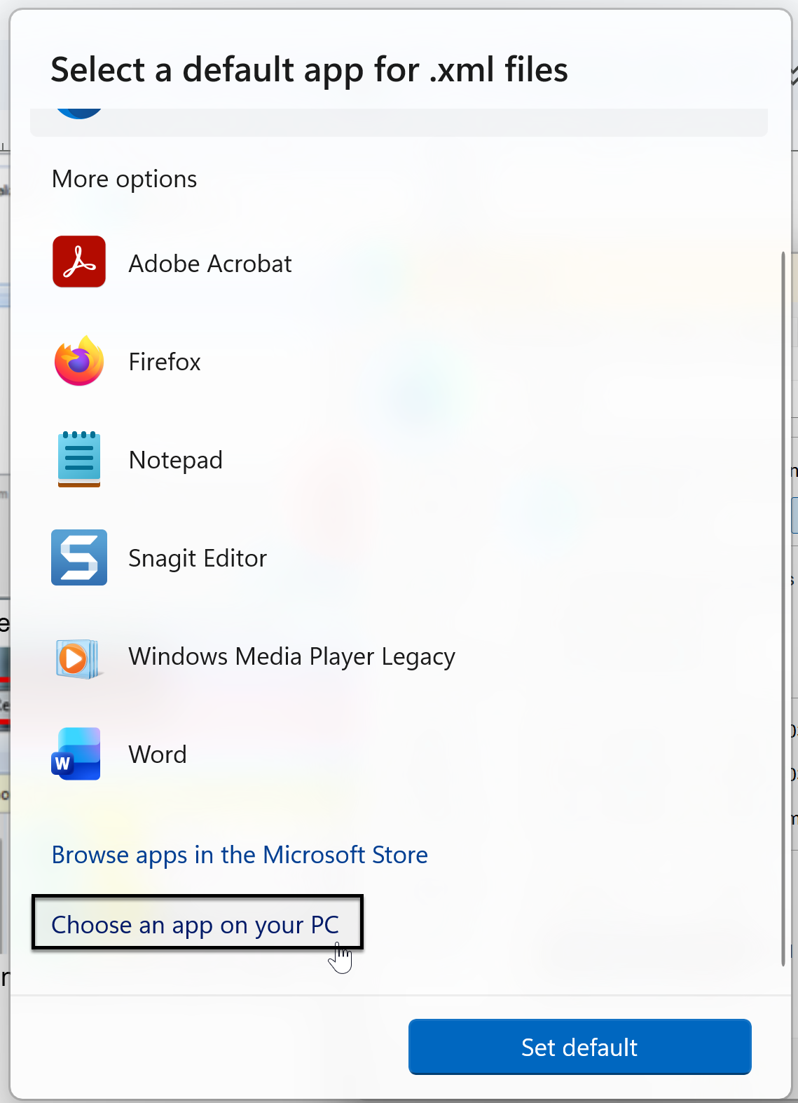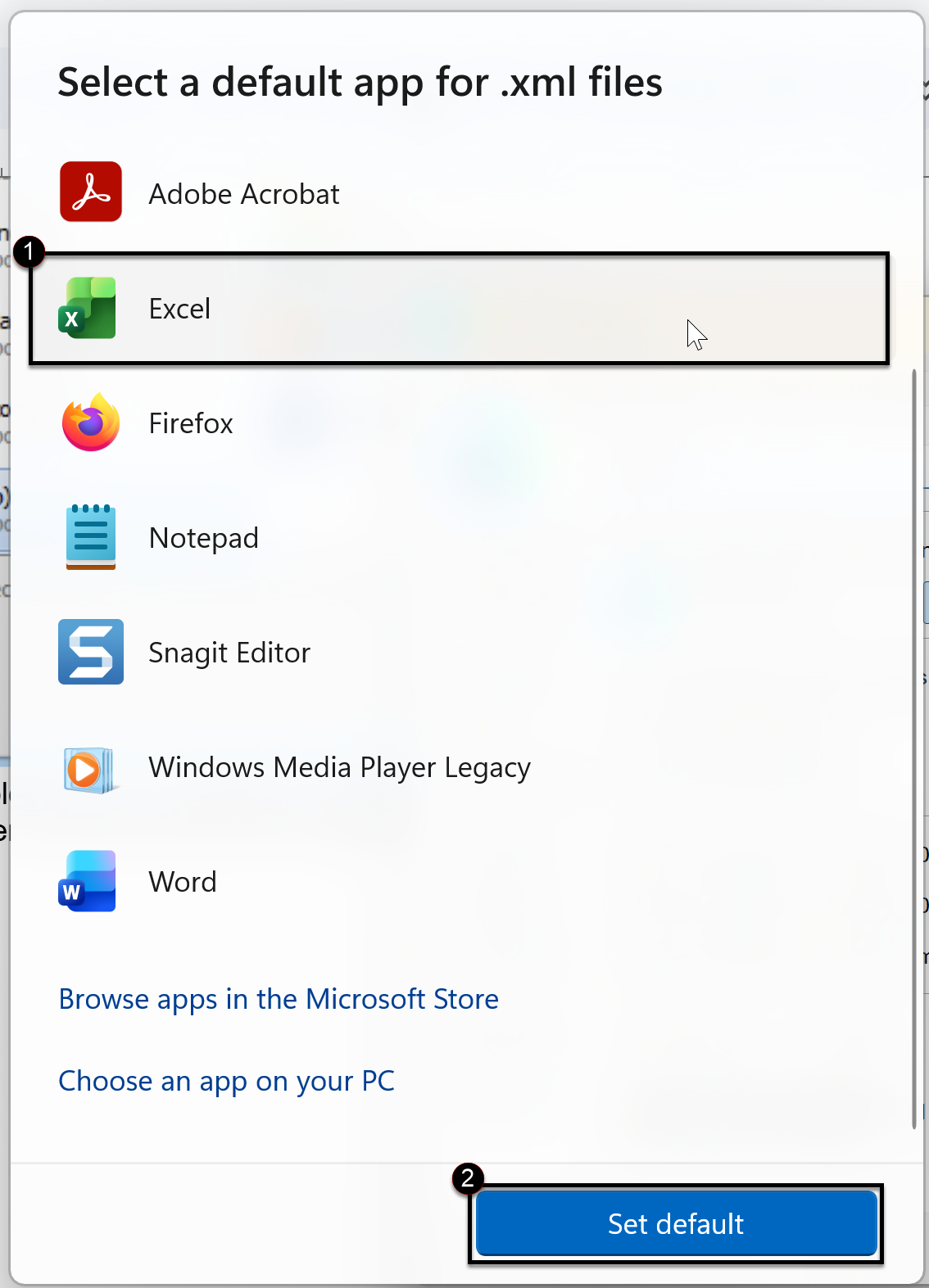 When you are at the Select a default app for .xml files screen, click the Excel program (icon) and then click the Set default button