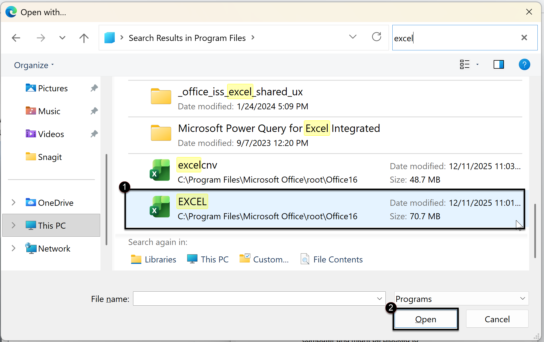 Click EXCEL and then click the Open button