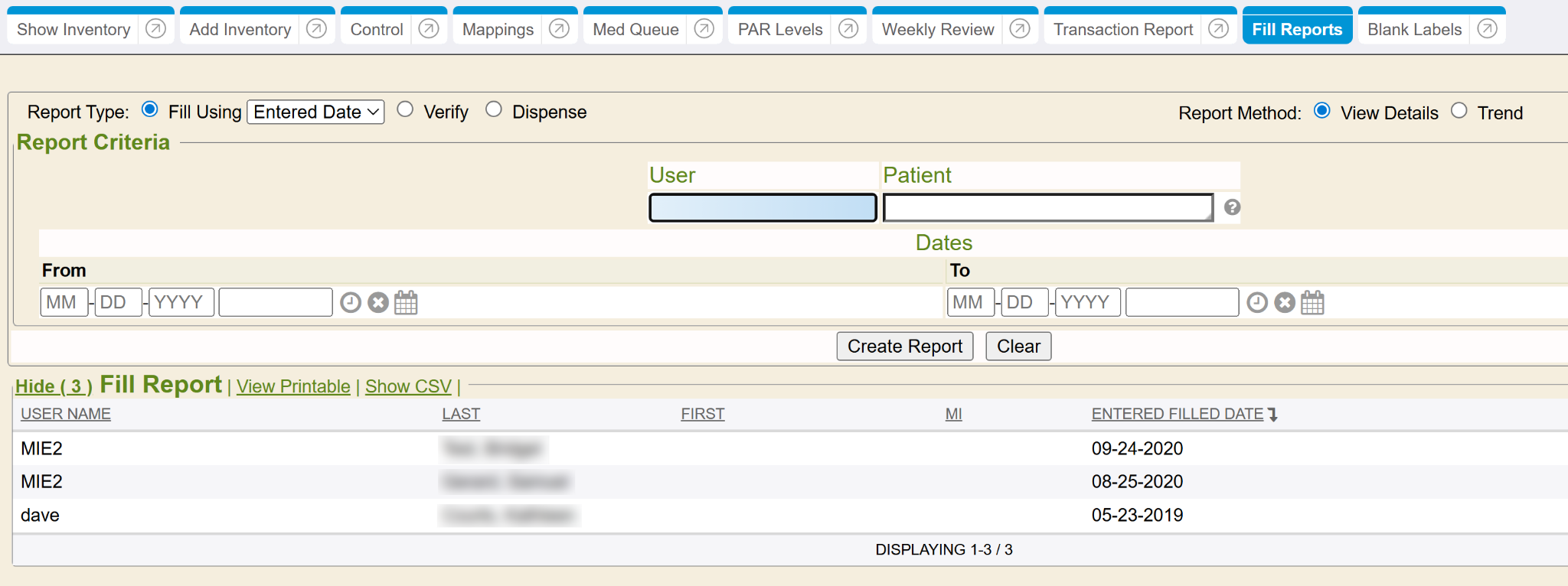 - Report Type: Fill Using Entered Date will report by the filled date that is entered in the patient’s dispense/fill. Fill Using Actual Date will report by the actual date time stamp the fill request was performed.