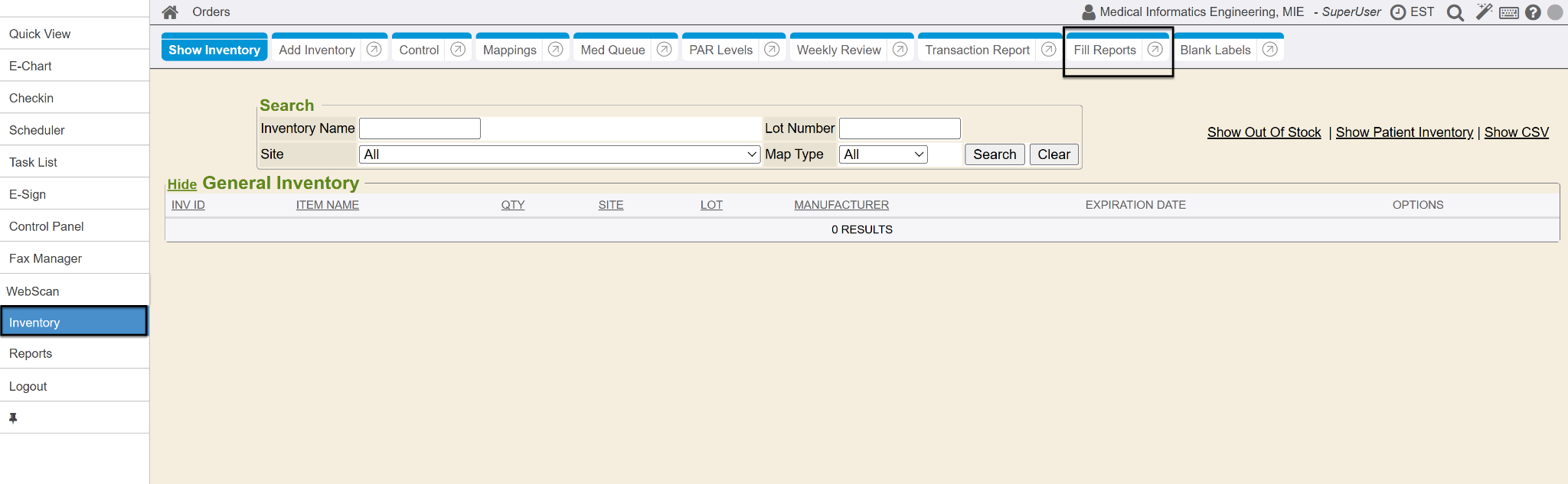 The Fill Reports tab is located within the sidemenu tab named Inventory.