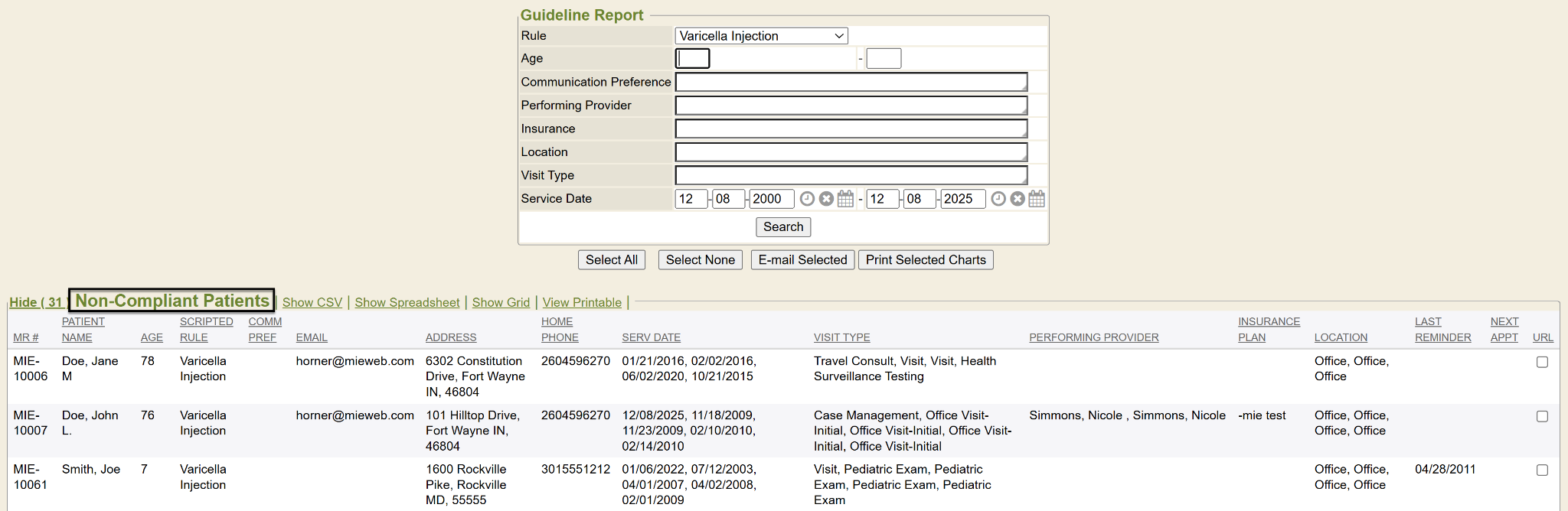 Guideline Report displays results/list showing all patients that are past due (non compliant) for a clinical guideline, which the criteria for being considered “past due” or “non-compliant” is programmed as a Scripted Rule in Enterprise Health . If the patient is “past due” or “non compliant” with the criteria you’ve asked MIE to program for a specific guideline, those will appear as “Guideline Alerts” in the patient’s chart wherever Warnings are shown. Ex: diabetic patient past due for a foot exam, pregnancy patient past due for a Glucose test, patient’s doe for a DTaP Injection, etc.