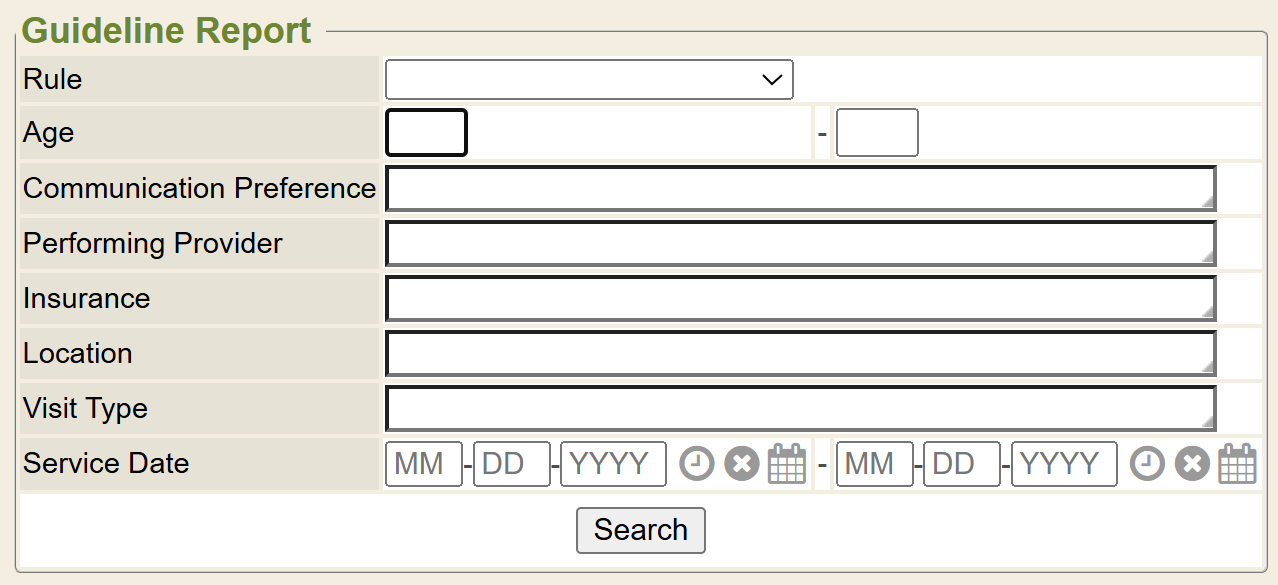 - Service Date: Can enter in encounter service date range to run this report by. Will result patients that have had encounters (in that specific encounter service date range) whom have the selected Guideline Rule/Alert currently on their chart.