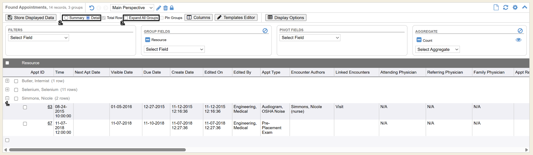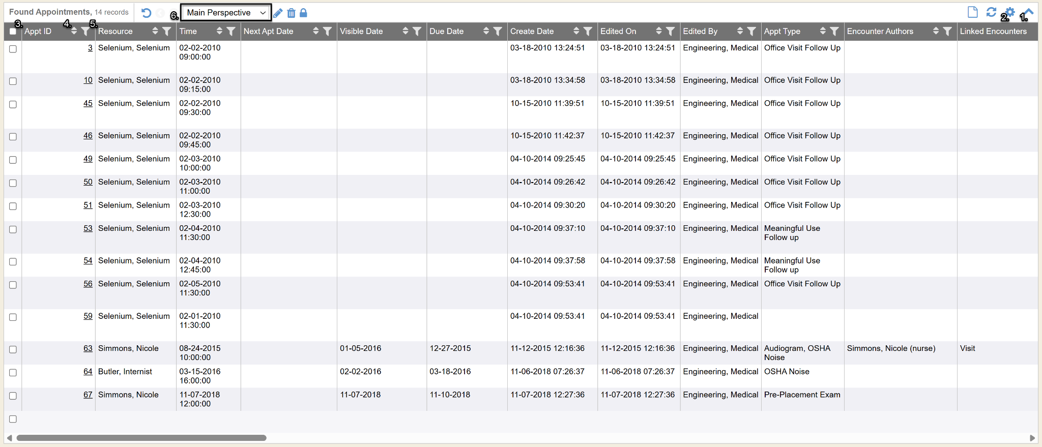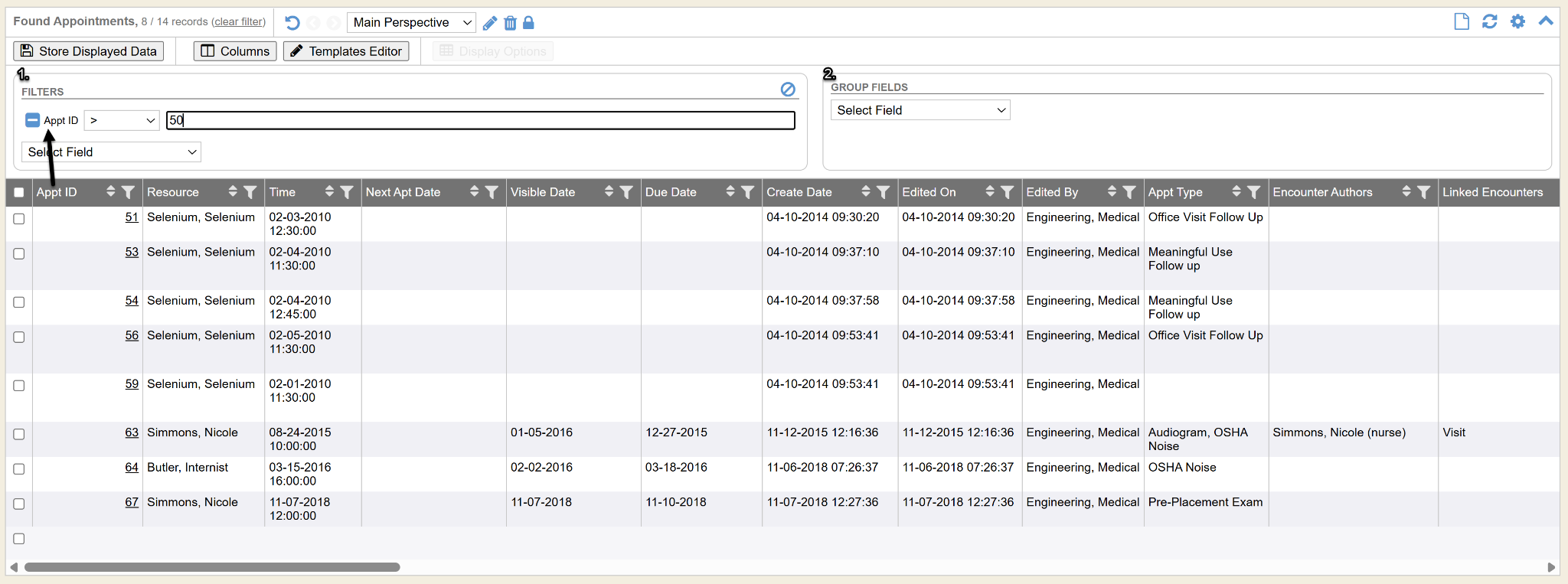- The filter control — here we have filtered by Appt ID. To add more filters, select the column name from the dropdown and click the “+” button, or drag the column header into the control, or click the filter icon in the column header. Use the “–” button next to each filter to remove it.