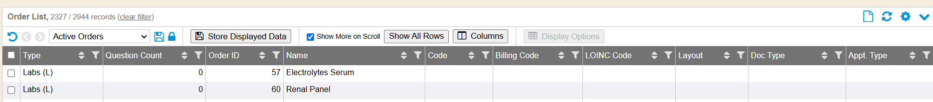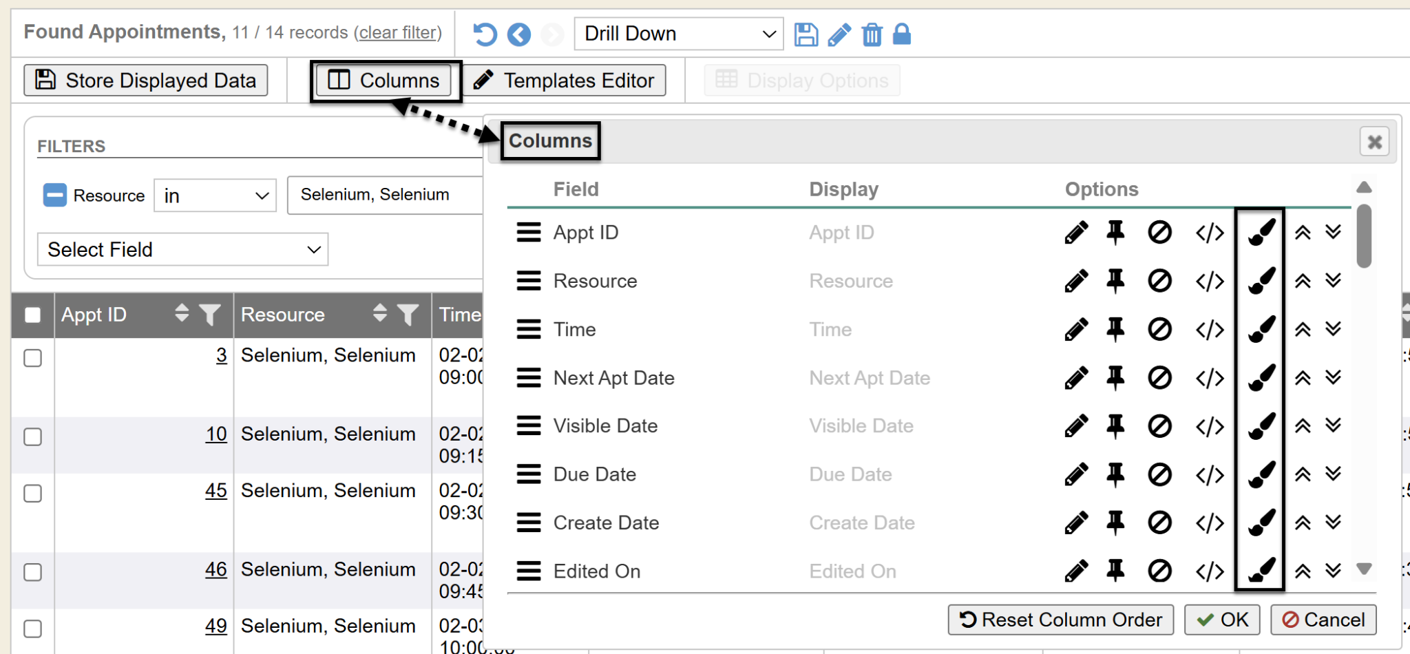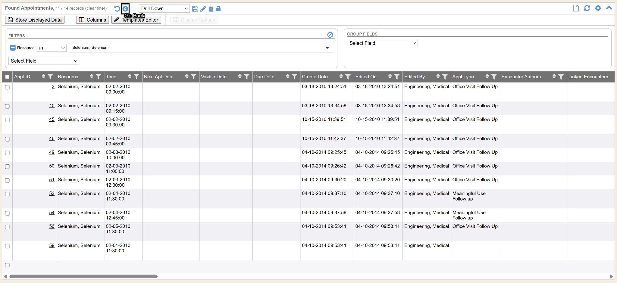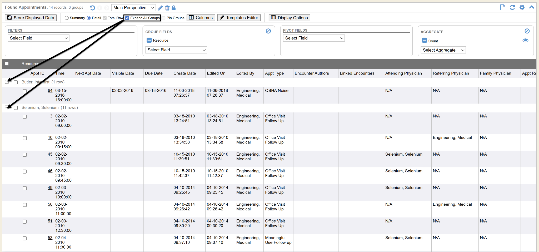 - The filter control — here we have filtered by Appt ID. To add more filters, select the column name from the dropdown and click the “+” button, or drag the column header into the control, or click the filter icon in the column header. Use the “–” button next to each filter to remove it.