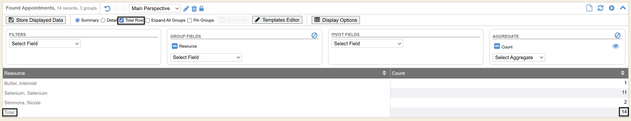 - With the “Summary” radio button selected, the “Total Row” button can be selected to display a total of the data