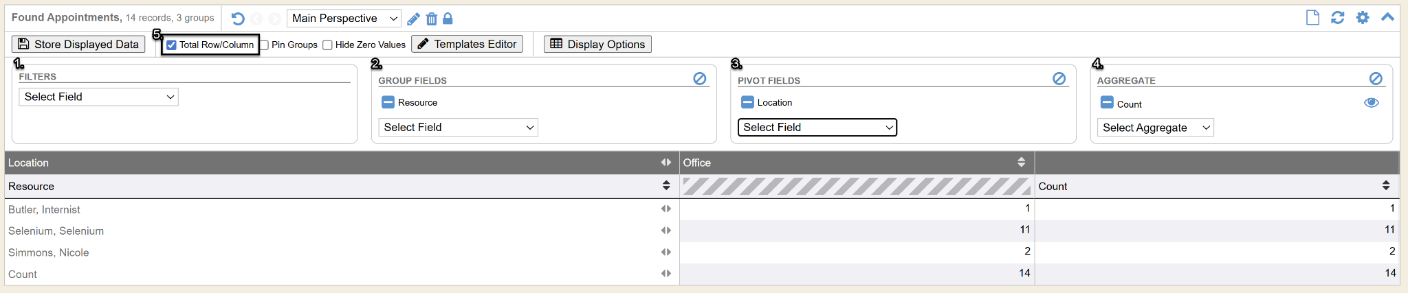 - The pivot control — we are pivoting by Location in this example. Like the group control, these fields can be reordered; to pivot by additional columns, select them from the dropdown and click the “+” button. To remove a column, use the “–” button next to the column name.