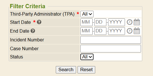 - End Date: The end date field will stop searching for claims that match the Date Sent (to the TPA). If no date is entered, the search will continue up to ‘today'.